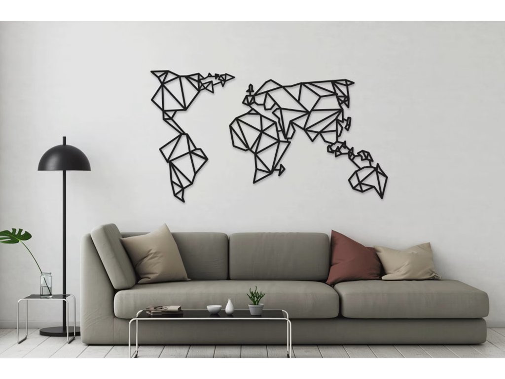 A Geometrikus világtérkép fali dekoráció a minimalizmus és a felfedezés találkozása.